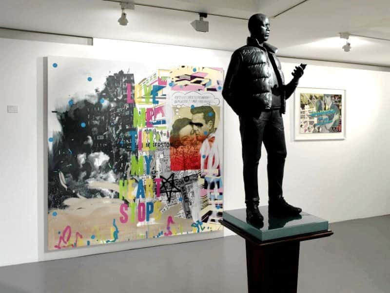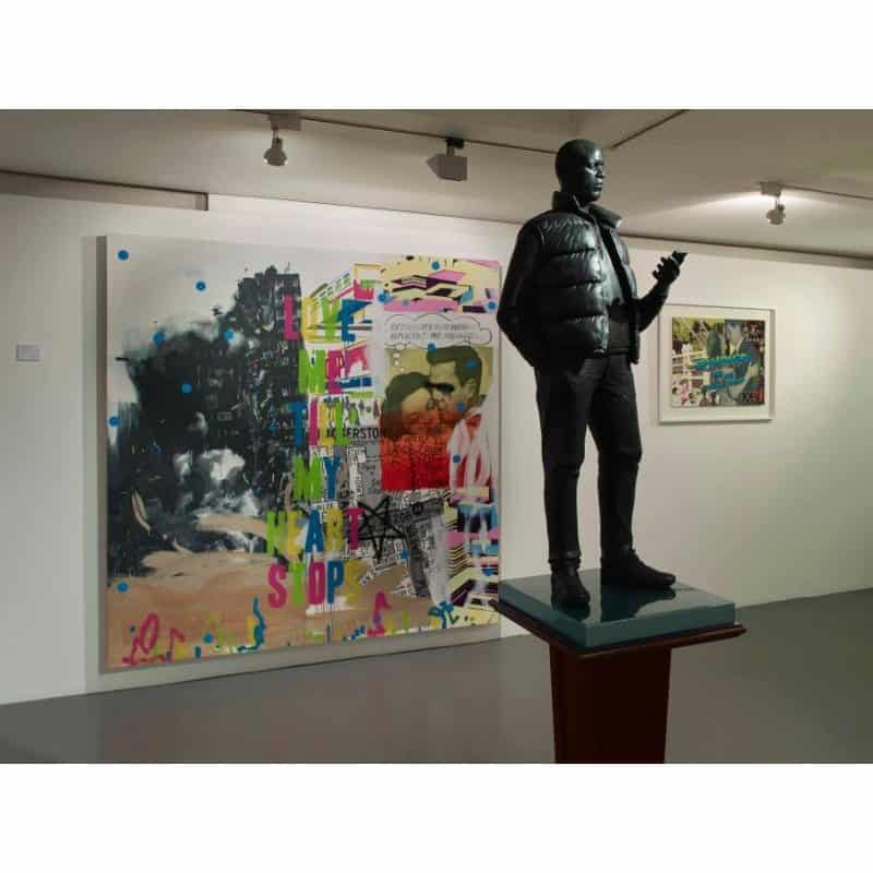 Installation view, featuring Stuart Semple – ‘War in a Babylon’ & ‘Panic Bar’ with Thomas J Price’s sculpture.