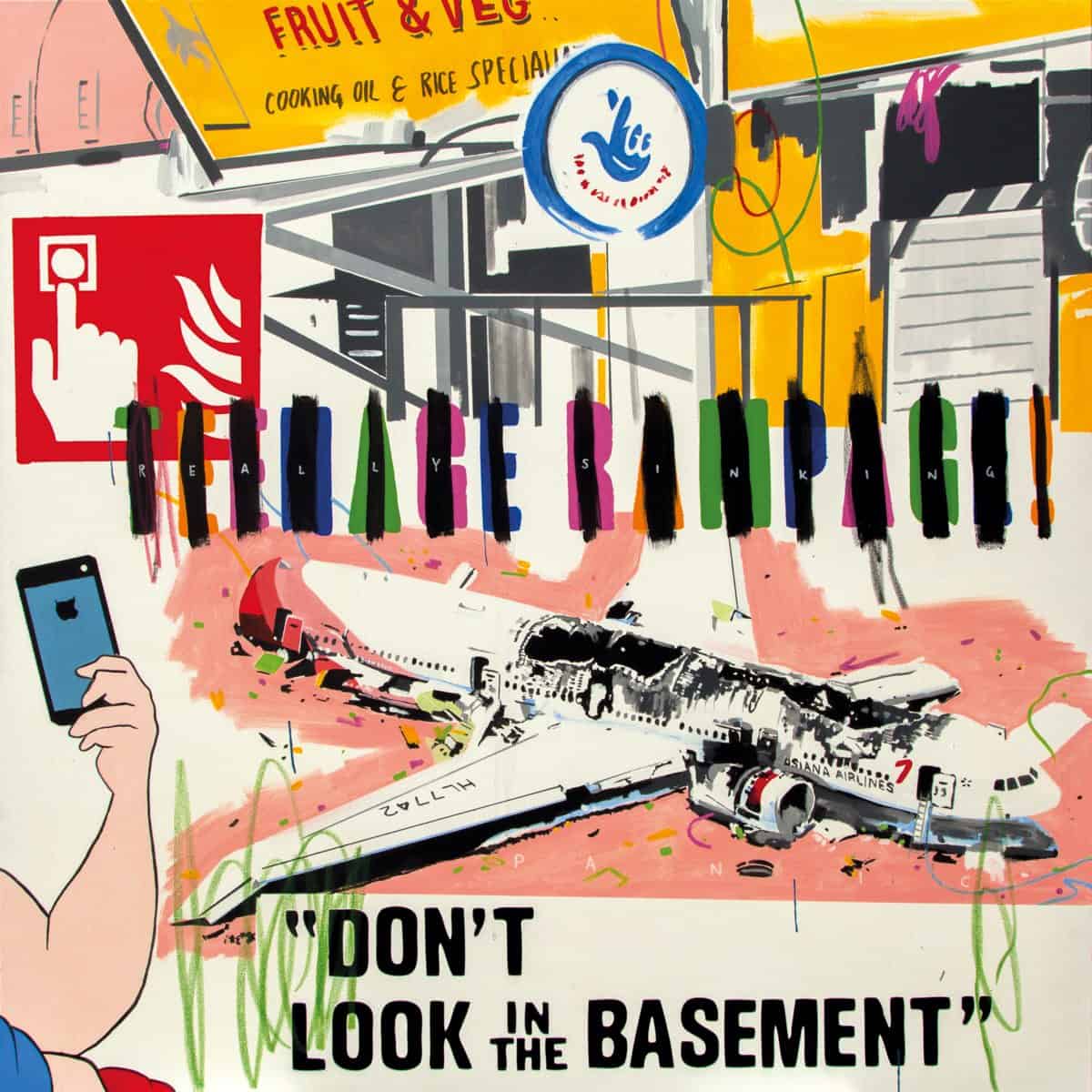 The narrative that runs through Anxiety Generation eludes to idiosyncrasies of Semple’s generation – solitude, hostility, disillusionment – all causes of and/ or fuelled by a greater anxiety. The painting, Wanna Be Startin’ Somethin’ represents a directionless and, consequently, hostile youth culture; a faceless youth, dressed in a tracksuit strides through a burning landscape, evoking images of the 2011 London riots. He is reminiscent of the lost of Semple’s generation – those who, in a world where everything is instant, accessible and free – where socialising is a solitary activity – have nothing to fight for, those who start their own wars to find things to be passionate about. Semple explains that people are “suspended between two states”: the over-stimulation caused by saturated mass culture and the “unconscious coma state induced by […] that flickering media-flow which ultimately shuts us down.” People live desensitised from reality, in a content middle ground, failing to face any extremes/fears. Despite this generation being free, without the constraints of war or any other threat, ambition is kept just for children; as demonstrated by All The Stars That Never Were, childhood ambition becomes disappointment/ disillusionment with age and the onset of adulthood. The anxiety of the generation is one associated with being nothing, achieving nothing and meaning nothing. But it is also, too, one focused on something foreboding, an anxiety of missing something, perhaps, sleeping through life while socializing alone at a laptop, living through screens.